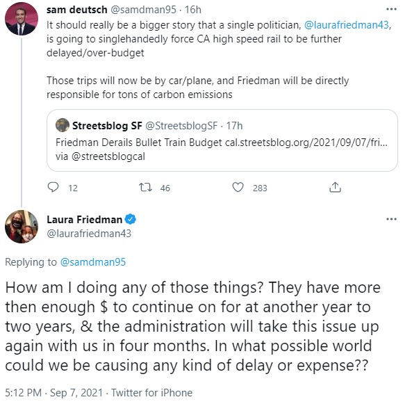 “They [CAHSRA] have more than enough $ to continue on for… another year to two years, & the administration will take up this issue again with us in four months. In what possible world could we be causing any kind of delay or expense??” (Laura Friedman, Twitter yesterday)