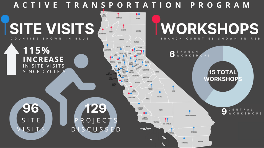 The meetings allowed staff to get a sense of the variety of active transportation solutions that cities are seeking, and to suggest improvements. Staff said that over time the number of people and agencies participating in site visits and workshops has increased by over 200 percent, and that these efforts have led to better communications, better feedback, better potential projects, better applications, and more applications as cities and agencies around the state learn more about the program.