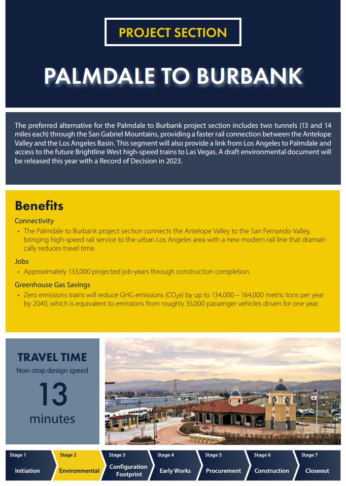 CAHSRA’s 2022 Business Plan (page 49) shows a non-stop travel time of 13 minutes between Palmdale and Burbank. CAHSRA spokesperson Jaime Coffee stated, via email, that for this section the design speed changes from 220 mph in Palmdale down to 150 mph as trains enter the San Fernando Valley and then 70 mph through the Burbank Station.