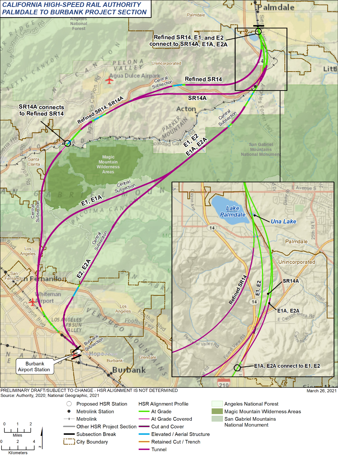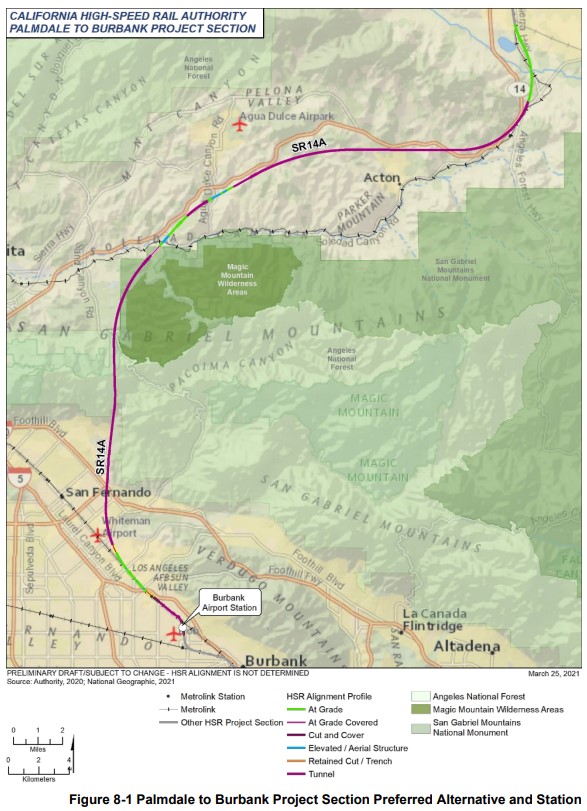 The EIR/EIS analyzed a half-dozen fairly similar alternatives, all with extensive tunneling. The Agency’s preferred alternative is SR14A which, deep underground, parallels the 14 Freeway between Santa Clarita and Palmdale. Just east of Santa Clarita the tunnel veers south. In Sun Valley, trains emerge to run at grade alongside the Metrolink Antelope Valley Line tracks (next to San Fernando Road) for a couple miles before going below ground to pull into the Burbank Station.