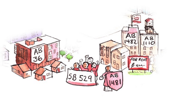 Twu includes a brief description of each of the bills he describes–although not of every last housing bill on the docket. Many cover similar territory, and as the legislative session winds through its course, they will change. So think of this as a snapshot of what the state is thinking about now, accompanied by Twu’s charming watercolor illustrations.